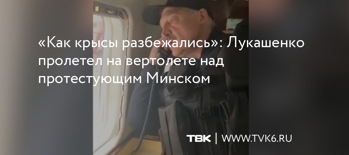 К вечеру в сети появились несколько видео с президентом страны Алексанром Лукашенко. На одном из них он со своим сыном облетает Минск на вертолете, просит пилота подлететь поближе к месту протестного шествия. Увидев людей, Лукашенко отметил: «Как крысы разбежались». В конце видео оператор показывает кабину вертолета, в которой находится 15-летний сын Лукашенко в военном обмундировании. Рядом с его отцом в вертолете лежит автомат.