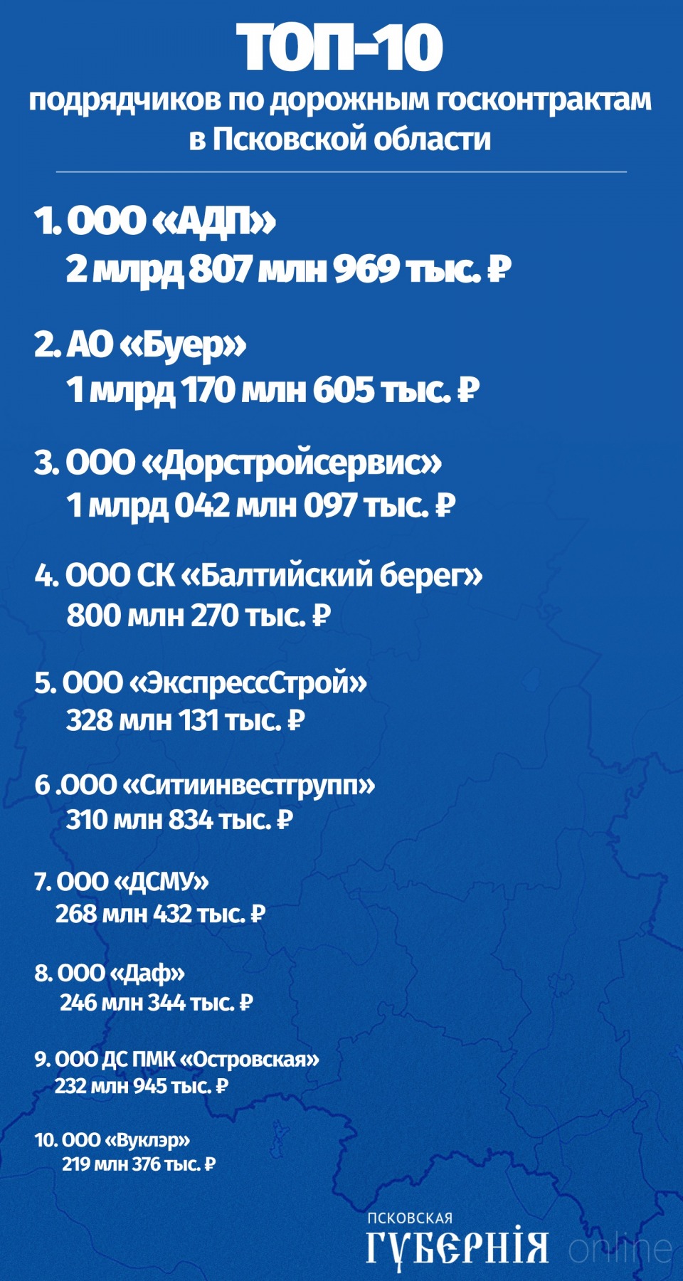 «Псковская губерния» представляет топ-10 крупнейших компаний, осваивающих дорожные контракты в Псковской области