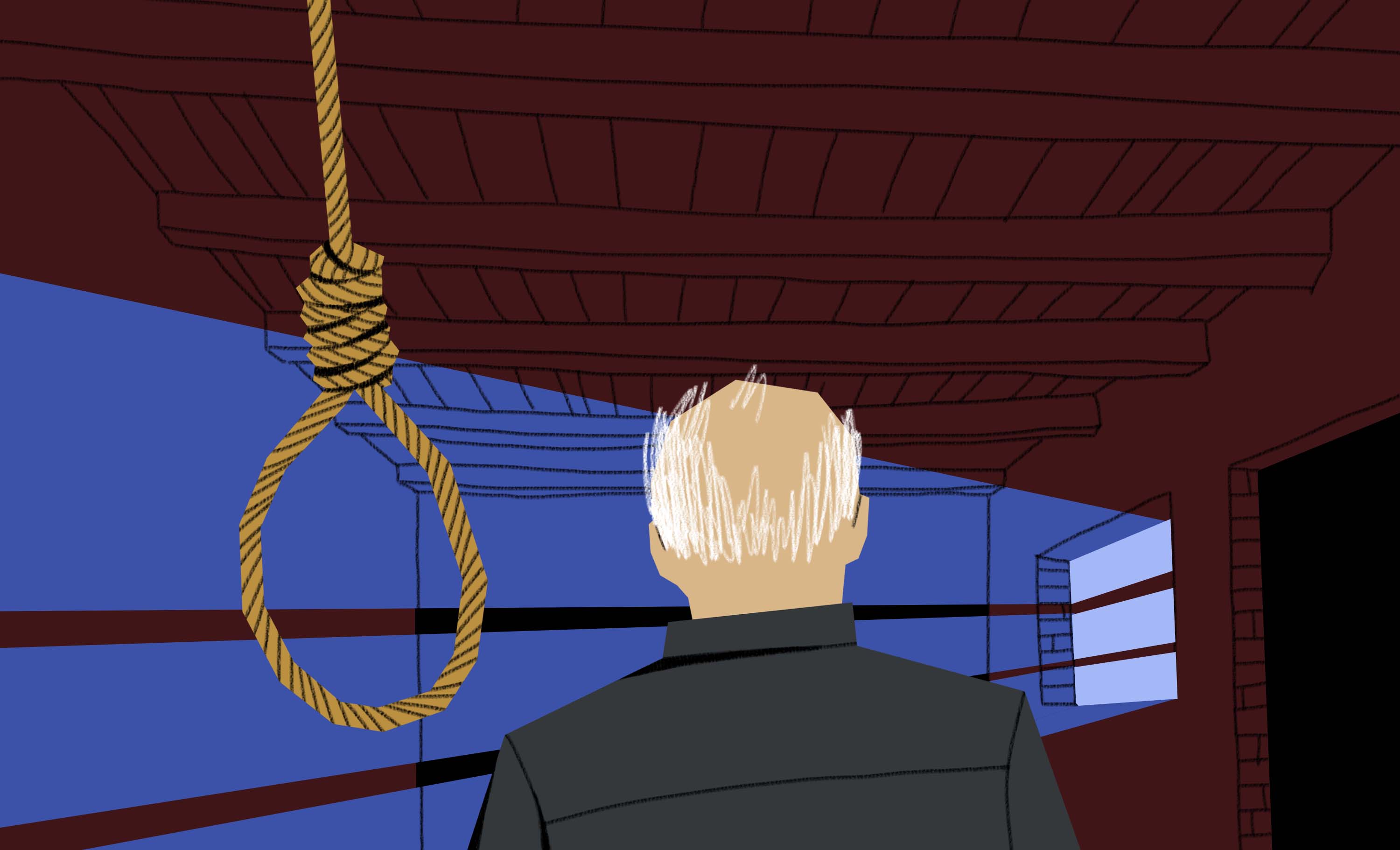 Она заметила, что одна из дверей в сарай закрыта на щеколду, а другая открыта и внутри горит свет: «Я сразу обомлела. Открыла вторую дверь, а он висит на веревке. Я подумала, что он только что повесился. Тронула — а он уже как камень застыл. На шее веревка у него, а он, видно на педали встал, там два старых велосипеда стояли, как запчасти он держал. Он на педали встал, одел на шею себе петлю к балке привязанную и с педали упал, и между сиденьем и рулем сидел. Как одетый был в костюм — он накануне думал, что адвокат к нему приедет — так и остался».