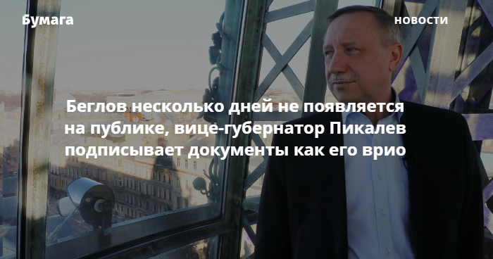 На сайте Смольного не объявляли об отпуске или командировке Беглова, при этом под одним из запросов на его имя в конце августа как врио губернатора подписался Валерий Пикалев. Он занимает должность вице-губернатора и координирует деятельность комитета по информатизации и связи, а также комитета по вопросам законности. Пикалева называют бывшим главным охранником резиденции Путина на Валдае.