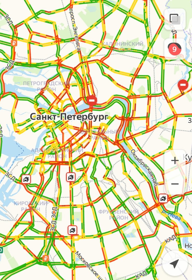 Водители стоят на дорогах в центре города, а также на КАД и ЗСД. Особенно сильные заторы — на Выборгской и Синопской набережных, Каменноостровском проспекте и Садовой улице.