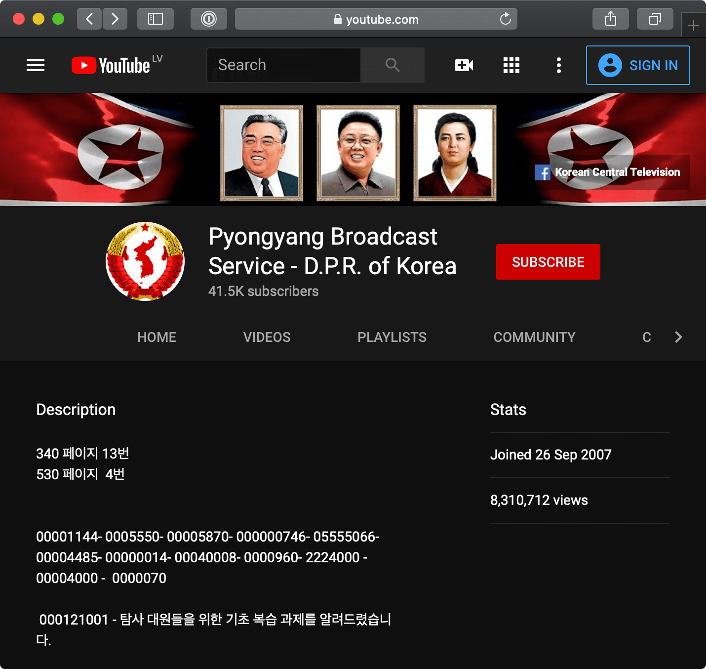 В описании ютьюб-канала радиостанции КНДР также можно найти таинственные коды — взгляните на скриншот. В последней строке по-корейски написано, что это «базовая задача по анализу для исследовательских бригад».