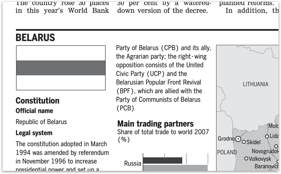 Случались и серьезные казусы. Например, в ноябре 2008 года газета Financial Times выпустила специальное приложение, посвященное Беларуси как привлекательному направлению для зарубежных инвестиций (оно было приурочено к Белорусскому инвестиционному форуму, который проходил в Лондоне в конце ноября того же года). «Медузе» удалось найти в архивах копию газеты с этим приложением. По контурам флага видно, что вместо государственного красно-зеленого флага Беларуси дизайнер по ошибке использовал бело-красно-белый, который использует оппозиция.