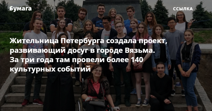 Издание «7х7» опубликовало текст о жительнице Петербурга Анне Петуховой, которая за три года организовала более 100 культурных событий в Вязьме — городе Смоленской области с населением чуть более 50 тысяч человек в 100 км от Москвы.