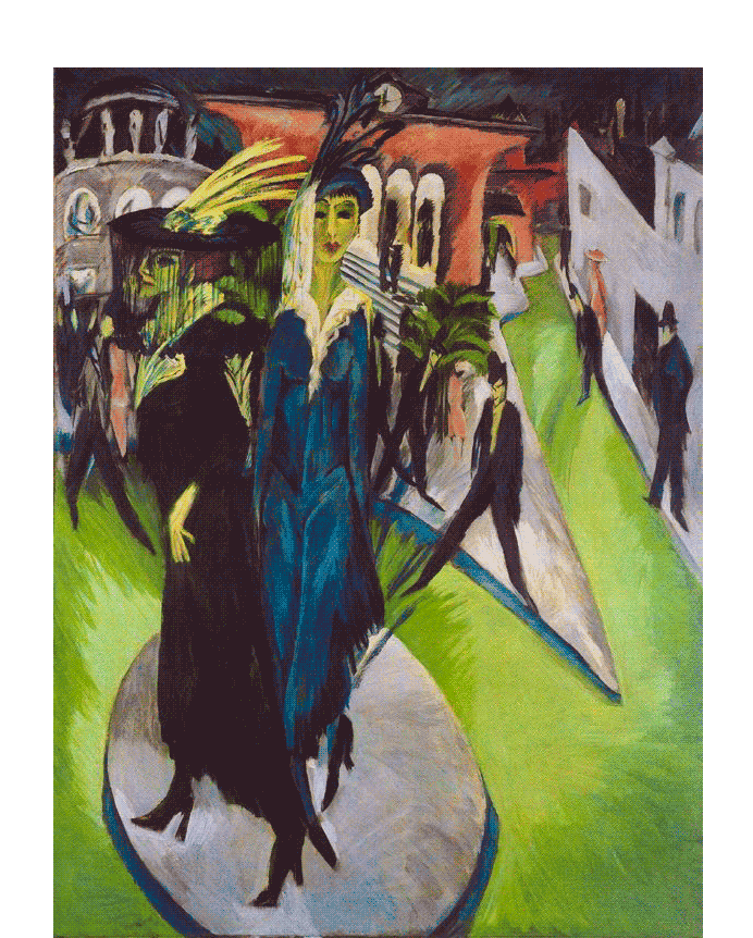 Если выйти за рамки литературы, то мы увидим тот же демонический город в «городских пейзажах» Эрнста Людвига Кирхнера, в которых разложение человека демонстрируется через искажение пропорций, бесконечные треугольники и зеленый цвет.