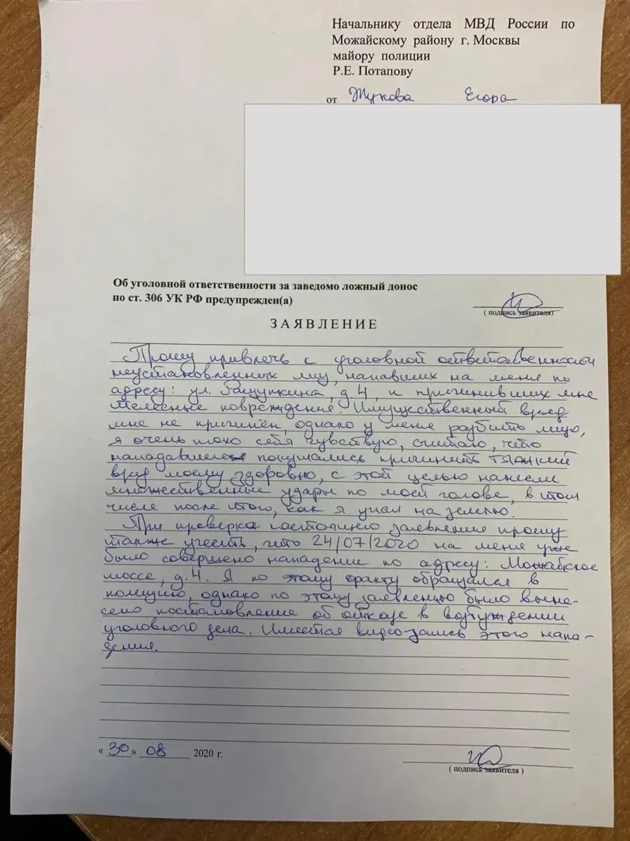 «Имущественный вред мне не причинен, однако у меня разбито лицо, я очень плохо себя чувствую. Считаю, что нападавшие покушались причинить тяжкий вред моему здоровью, с этой целью нанесли множественные удары по моей голове, в том числе после того, как я упал на землю», — написал Жуков в заявлении.
