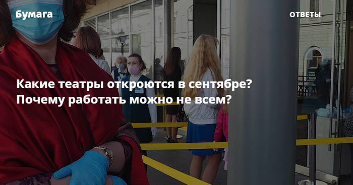 Какие театры можно посетить уже в ближайшие дни, как зрителей будут оберегать от коронавируса и почему большинство культурных учреждений города пока не могут вернуться к работе? «Бумага» отвечает на главные вопросы о новом театральном сезоне в условиях продолжающейся эпидемии.