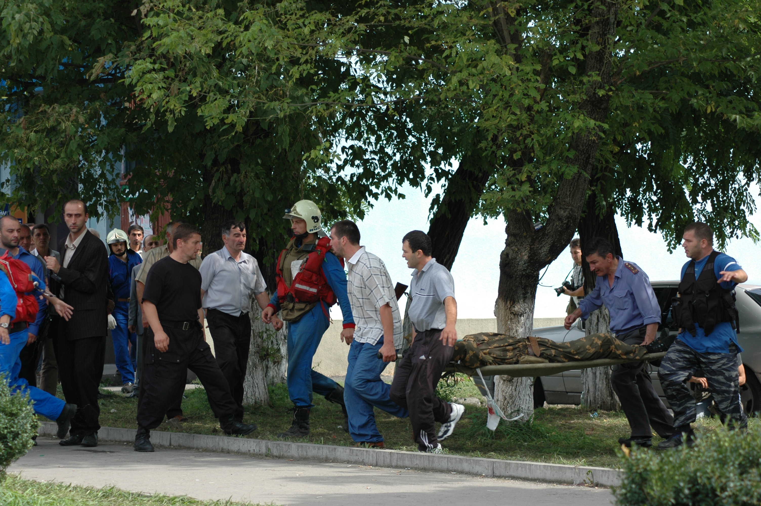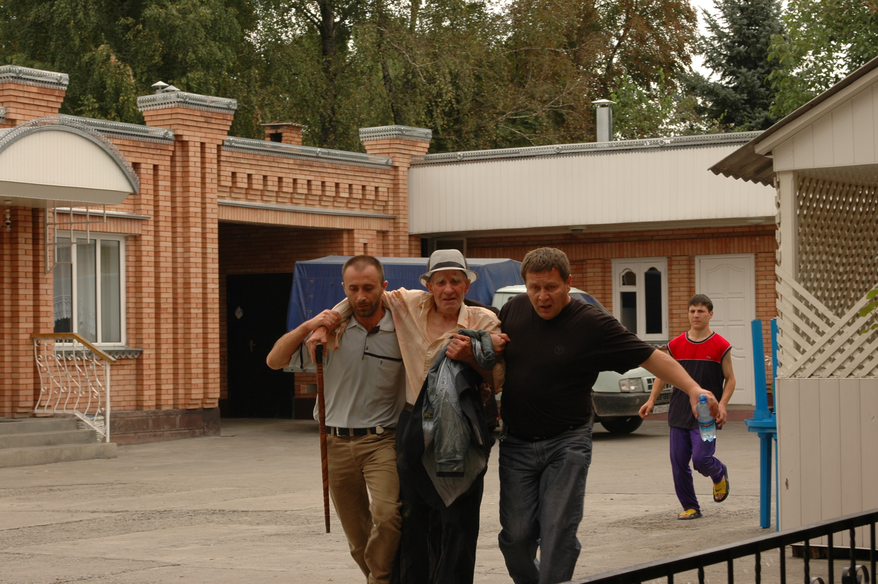 Больница – единственное, наверное, место во всём этом хаосе, где царил порядок. Вход охраняют автоматчики, но через него никто и не пытается прорваться в палаты, собравшиеся возле больницы люди в шоке и истерике, но из последних сил всё же держат себя в руках. Вышедшие на свежий воздух покурить-подышать медики говорят, что сейчас у них больше 200 человек: "Раны в основном минно-взрывные, осколочные, есть пулевые, ожоговые, практически все в шоке. Ещё примерно 400 увезли в больницы Владикавказа".