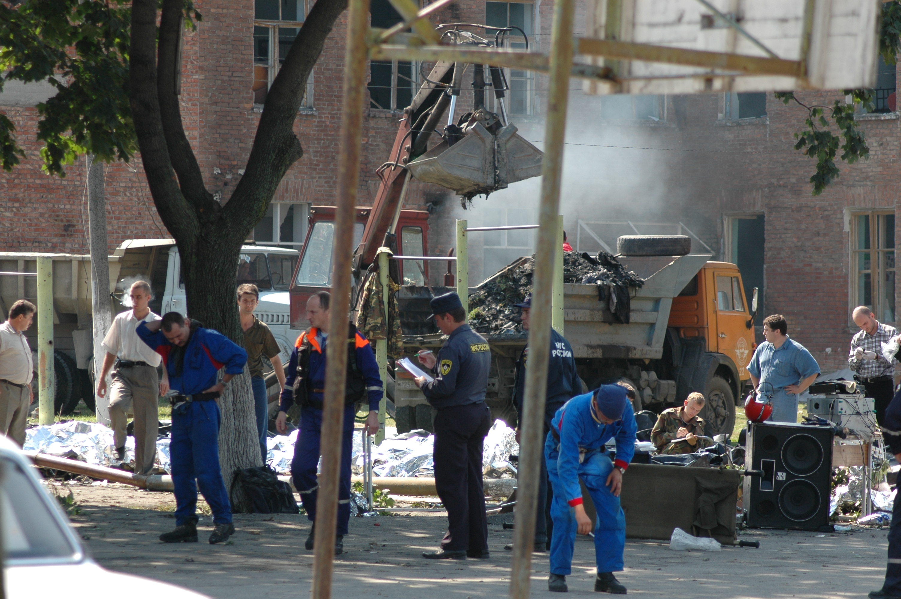 Как это делалось, автор этих строк своими глазами видел утром 4 сентября 2004 года. Еще дымилась выгоревшая школа, на её дворе выкладывались сохранившиеся тела, прикрытые от жаркого солнца фольгой, отдельные тела уносили на носилках, люди в штатском заполняли какие-то бумаги, сотрудники МЧС разбирали завалы, выгребая все из здания в тот же двор. Но затем весь этот выносимый из школы "хлам" сгребал в кучу урчащий во дворе небольшой трактор-экскаватор, затем захватывал своим ковшом и сгружал в кузова КамАЗов.