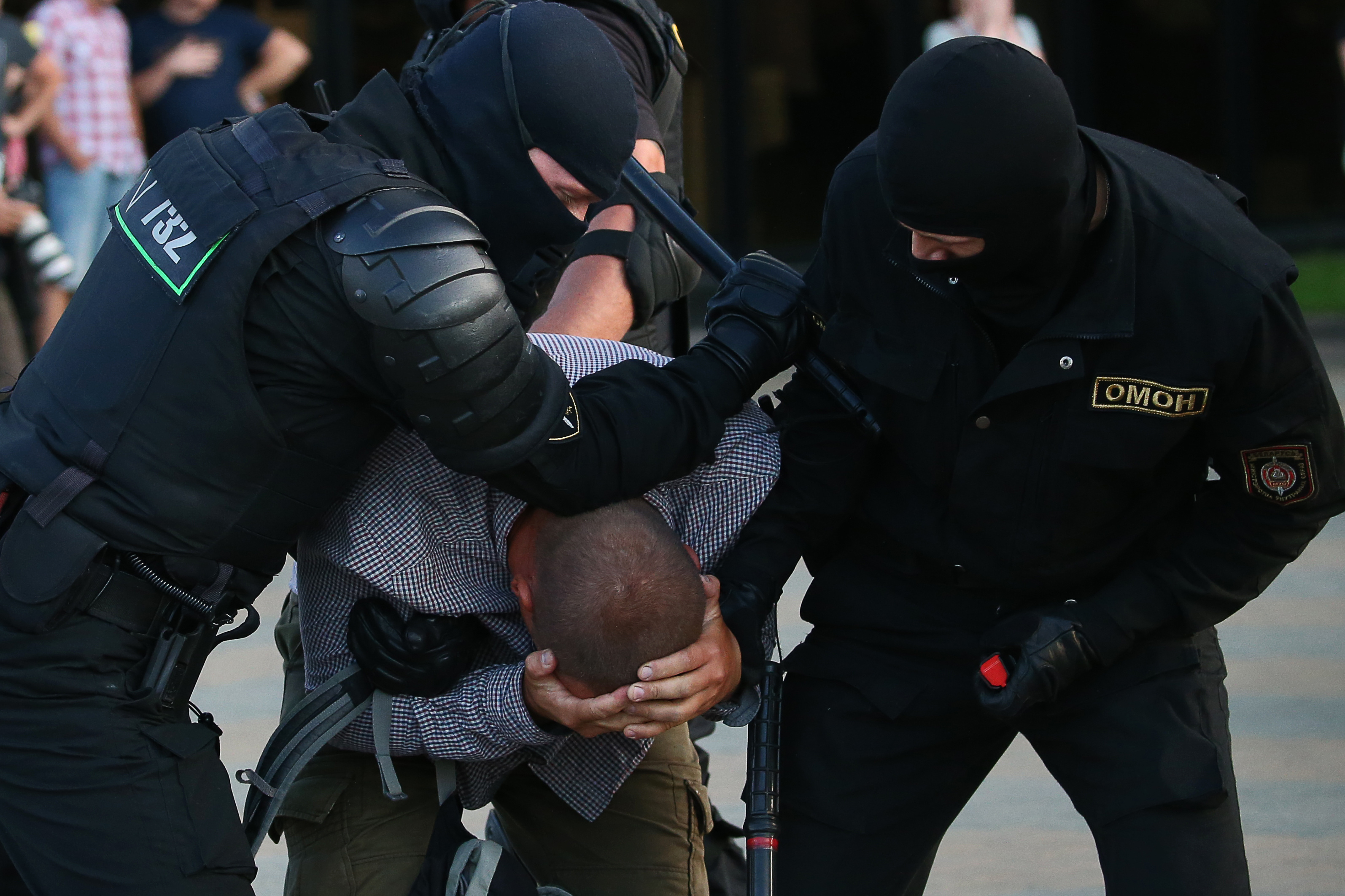 – Хватали в основном молодых мужчин – неважно, проявляли они как-то себя или нет. Я лично только рукой махнул в сторону машины, из которой песня Цоя неслась: "Хочу перемен" – кстати, очень популярная сейчас у белорусов, отовсюду доносится. Со мной в автозаке ехали люди, которых буквально от семьи – жены и детей – схватили, кого-то просто сидевшего на лавочке у фонтана взяли, кто-то вышел в магазин, когда хватанули, кто-то выходил из автобуса – его под белы ручки на выходе взяли, кто-то просто шёл по тротуару или стоял. То есть люди не совершали ничего провоцирующего, они просто находились в радиусе трёх метров от хватавшего их сотрудника органов внутренних дел. Видимо, стояла задача зачищать, хватать без разбора необходимое количество, а там будем разбираться. Запугать – вот так ставилась задача, видимо. Поэтому исполнение было соответствующее. Четыре омоновца налетают на человека, молотят дубинками и в автозак.