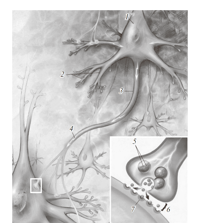 Нейроны и синапсы — химический синапс. 1 — тело нейрона, 2 — дендриты, 3 — аксон, 4 — передаваемые нейроном электрические импульсы, 5 — молекулы нейротрансмиттеров, 6 — синаптическая щель, 7 — постсинаптический рецептор