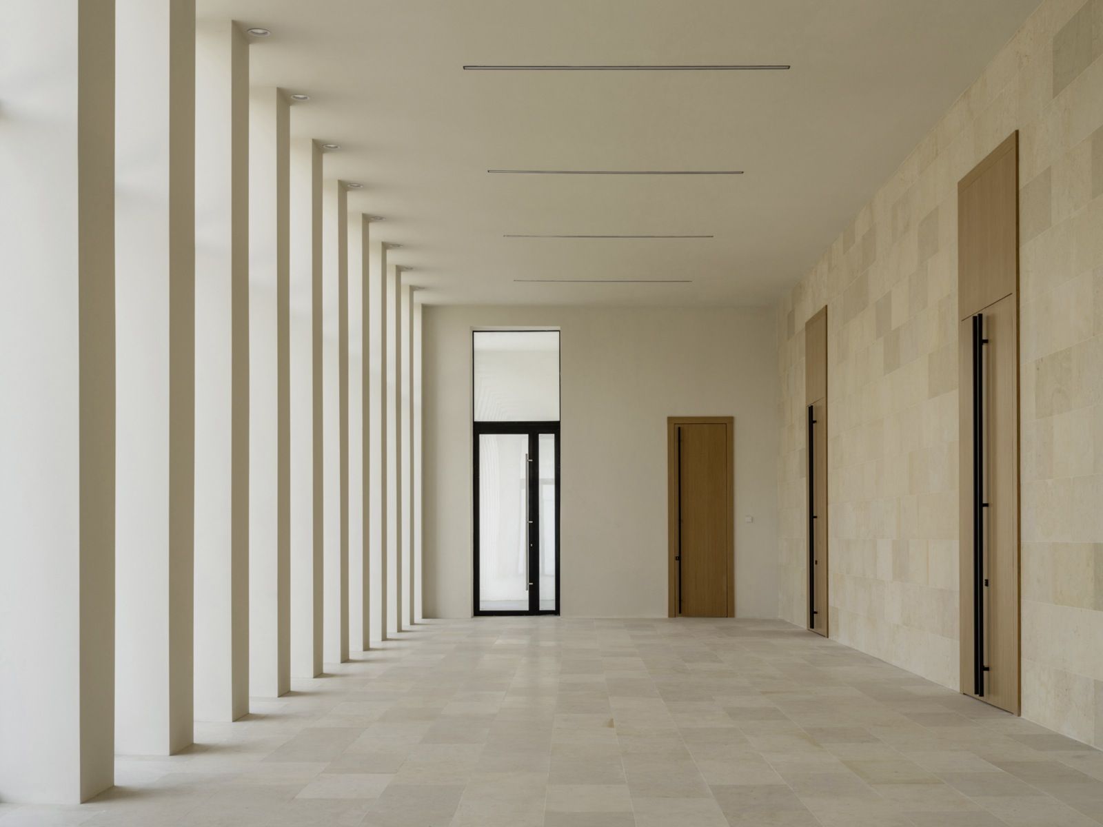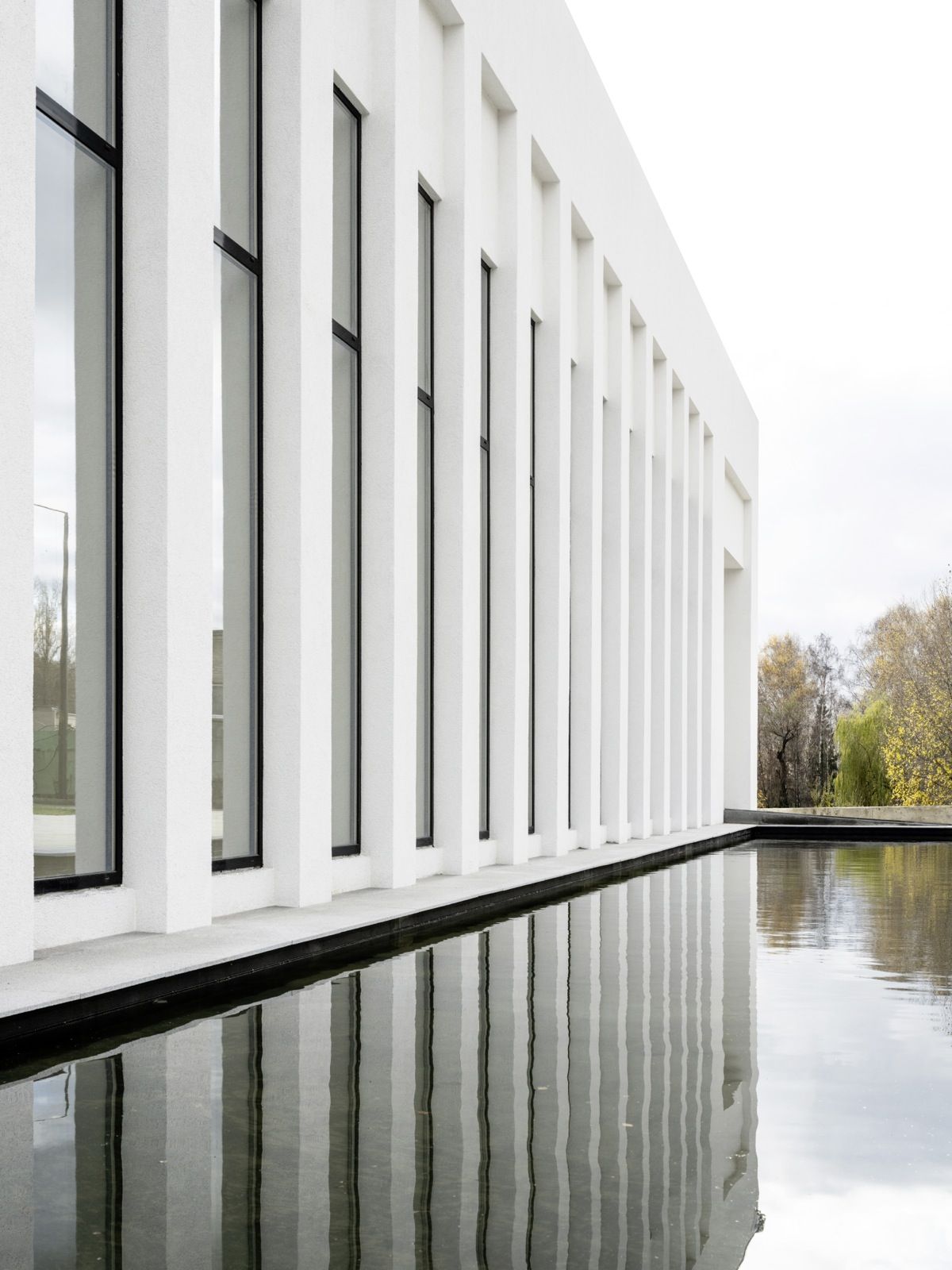 Во-первых, здание получилось очень легким и проницаемым вопреки своим внушительным 1070 квадратным метрам. «Воздух» появился за счет простой геометрии, светлой гаммы и больших площадей остекления. Через окна видно, что происходит в фойе за центральным фасадом и в служебных помещениях по бокам. Участники траурных церемоний не отрезаны глухой стеной; единственными скрытыми от посторонних глаз пространствами остаются залы для прощаний — они находятся в центре здания за массивными дверями во всю высоту помещений.