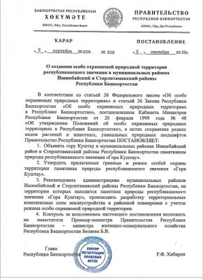 2 сентября правительство Башкирии объявило шихан Куштау памятником природы республиканского значения «Гора Куштау».