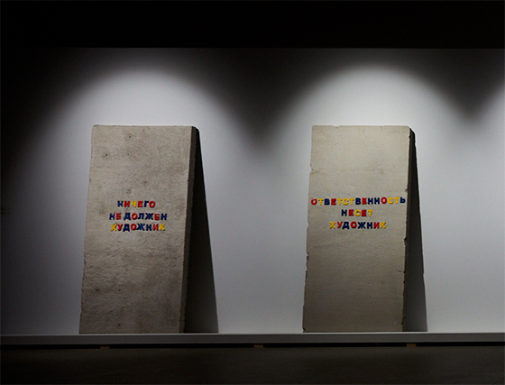 © Михаил Вильчук Игорь Лазарев. Свобода быть художником, инсталляция. 2020 (деталь) Поразительно наблюдать то, как этот скроенный на себя опыт конвертируется в жизнь посетителей выставки, которые долго и внимательно читают мысли Аси Маракулиной о том, как превратить чужой город, враждебные улицы в свое обжитое человеческое место («Правило шва» (2014–2015, 2020)). Проблемы мира и колониализма «Правило шва» разворачивает под сугубо личным углом зрения — углом, где происходит обживание самой себя и дальше самой собой своего места: дома, улицы, окрестностей города. Среди нарочитого коллективного треша такие оазисы воздвигнутой, воздетой личной образности, всегда теперь очень осторожной, следящей за собой, драгоценны.