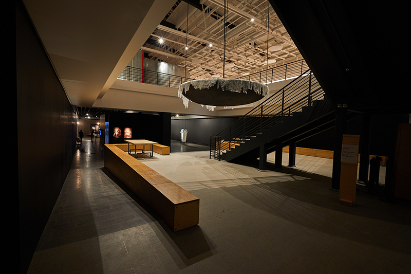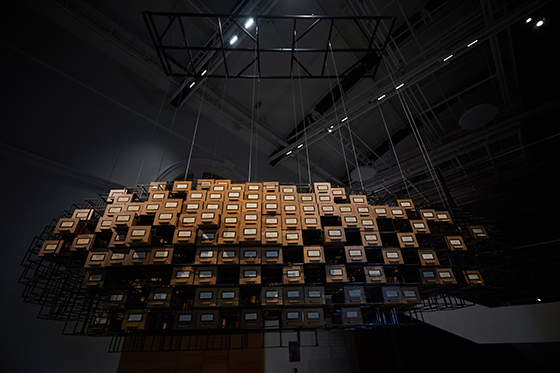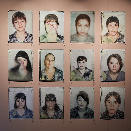 © Михаил Вильчук Александр Морозов. Станция Дистопия, инсталляция. 2020 Значительную часть экспонатов можно без колебаний сделать частью музейного собрания — сохранить в качестве капсулы времени. Ясно о силовых полях и машинах наших дней свидетельствуют многие образы. «Дирижабль», собранный в железных сетках из каталожных ящиков спецархива, — инсталляция Александра Морозова «Станция Дистопия» (2020) о Н.Е. Лансере, который перестраивал Манеж под нужды гаража ОГПУ, трудясь в шараге, возвращает нас к вопросу о цене и последствиях советской модернизации 1930-х, осуществленной в значительной степени силами зэков (какой была бы страна, отстроенная свободными людьми?); впервые в таком масштабе, словно на городской площади, зрители оказываются глаза в глаза с заключенными женских колоний в фотоинсталляции Елены Аносовой «Отделение» (2014) — эти фотопортреты многих заставят вспомнить Нэн Голдин, неважно, что они не про любовь и сексуальное насилие здесь и сейчас, а про бесконечно переживаемые боль, ненужность, попытки обустроить тюремное существование;
