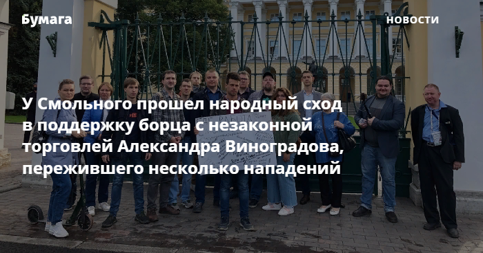 Активисты Центрального района провели у Смольного народный сход в поддержку борца с незаконной торговлей Александра Виноградова.