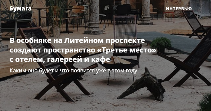 В особняке Лопухиных и Нарышкиных на Литейном проспекте, 62 откроют пространство «Третье место». Дата полноценного запуска пока неизвестна, но на месте уже работает поп-ап-проект «12» — кафе в стиле северных пляжей с устрицами и диджей-сетами. До конца года там откроются новые проекты и пройдет арт-ярмарка, а в будущем заработают отель, галерея, бар и ресторан.