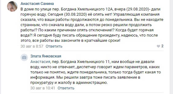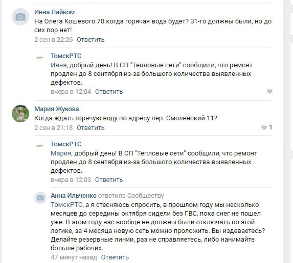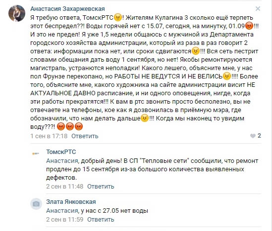 В жалобах томичи ссылаются на то, что воду должны были дать в течение 14 дней с момента отключения. Так, в доме № 40 поселка Спутник срок отключения на сайте администрации составил почти три месяца. Аналогичная ситуация в домах микрорайона Степановка, где воду жильцам дали только спустя два месяца.