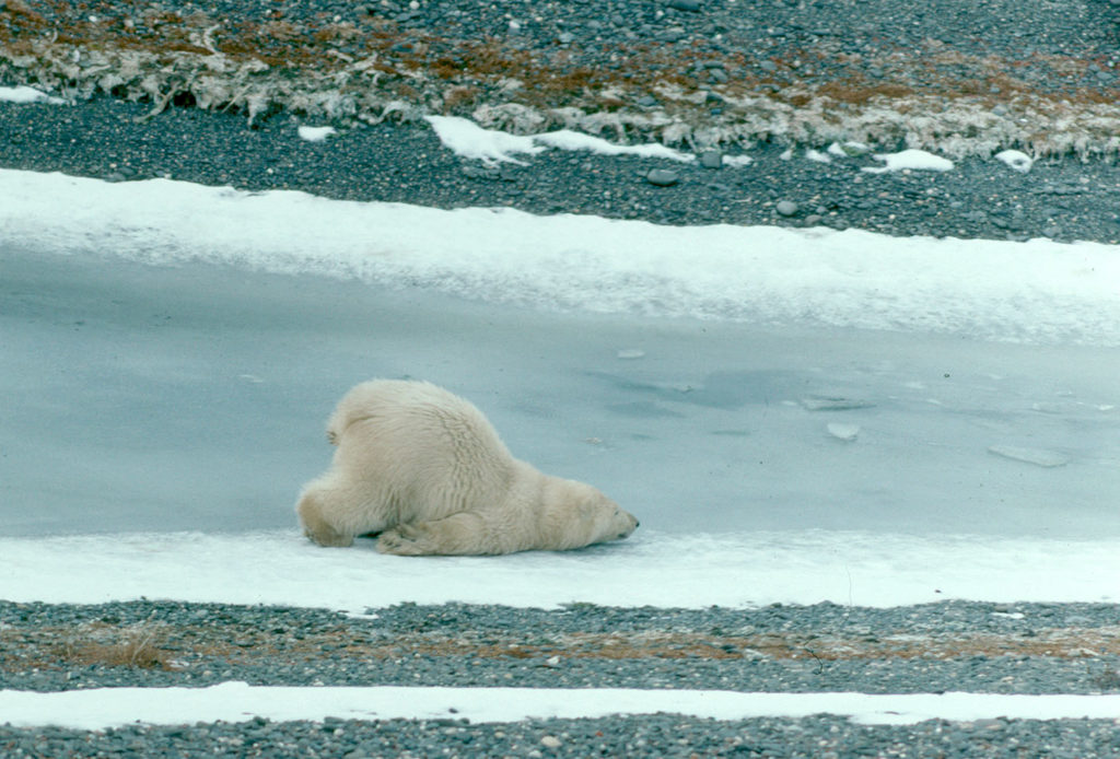 В 1980-х годах увидеть белых медведей на побережье на острове Врангеля можно было очень редко — хотя их тогда было много, официально численность оценивалась в 3-5 тысяч животных, а по моим предположениях, их могло быть до 6 тысяч. Медведи жили на льдах — в тот период лед стоял на море круглый год. В районе мыса Шмидта даже летом в июле на лодке проскочить было практически невозможно — приходилось ждать несколько суток, пока лед отожмет ветром от берега. Так что за четыре первых года работы в Арктике белого медведя я видел всего один раз. На берег они почти не выходили, бродили где-то на льдах. В 1989-м году я перебрался на Врангеля и начал с ними сталкиваться достаточно близко — тогда опасных ситуаций стало значительно больше. А 1990 год был первым за десятилетие, когда лед ушел очень далеко, море очистилось до горизонта — и появились первые скопления белых медведей в районе жилых поселений. У них практически не было мяса, они были вынуждены поедать шкуры моржей — серьезно голодали, несколько животных погибло из-за истощения. На нас они, тем не менее, не нападали.