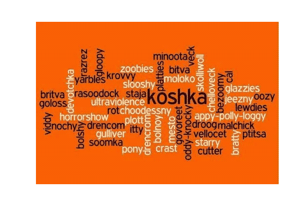 Берджесс использовал русские слова, написанные латиницей: devotchka, nozh, moloko, droog, bezoomny, bolnoy, litso, oobivat и другие. Orang у Берджесса означает «человек» — игра слов, построенная на созвучии с английским orange — «апельсин». Это тоже заимствование, но не из русского, а из малайского языка (отсюда «орангутанг»; orang utan — «лесной человек»).