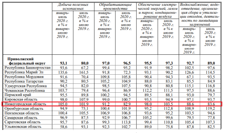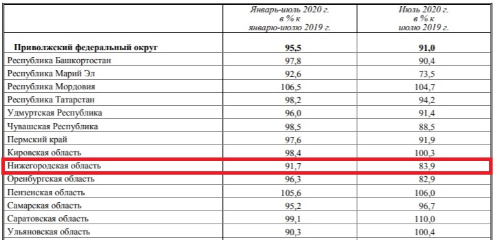 Согласно обнародованной информации, за период с января по июль 2020 года индекс промышленного производства в Нижегородской области составил 91,7% Это второй результата с конца рейтинга субъектов ПФО.