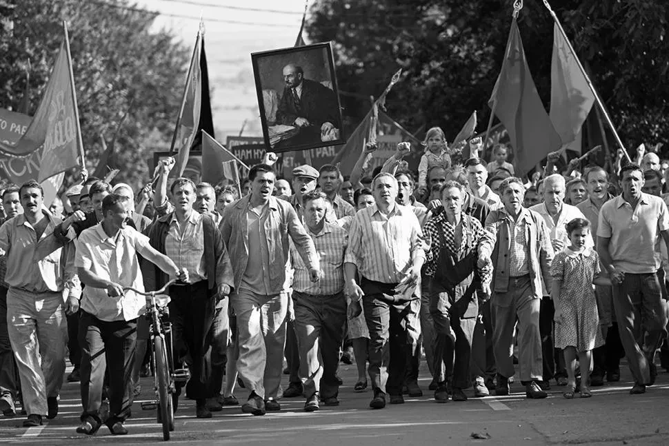 И да, это кино про современность, даже если режиссер имел в виду только время — почти 60 лет назад. Все рифмуется. И партократы всех мастей, запуганные «враждебными элементами, пляшущими под дудку вражеских голосов». Готовые на крайние меры. И где-то там наверху Хрущев, срочно собирающий президиум ЦК. И бесправные, решившие, что на дворе демократия, что возможен мирный протест. Что сталинское людоедство кончилось. Что своя армия не может стрелять в «дорогих товарищей». В результате людей, вышедших на площадь, смели автоматными очередями и пулями снайперов. Система не умеет по-человечески.