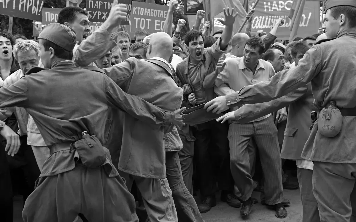Крепкий сценарий дотошно воспроизводит события. Это и сама демонстрация с лозунгами «Зарплата!» и «Хрущева на колбасу!» (в кадре даже появятся подлинные фотографии демонстрантов — гэбэшники в штатском, как и сегодня, снимали в толпе тех, кого завтра следовало арестовать). И партчиновники во взмокших от страха рубашках. И тот единственный армейский генерал, «который не стрелял». Только в реальности это был не Плиев, он-то как раз приказывал двигать танки на демонстрантов, а генерал Матвей Шапошников. Если бы он выполнил приказ Плиева, погибли бы тысячи. Зато сталинист, второй секретарь ЦК Фрол Козлов, прибывший из Москвы вместе с умеренным Микояном, настоял на расправе.