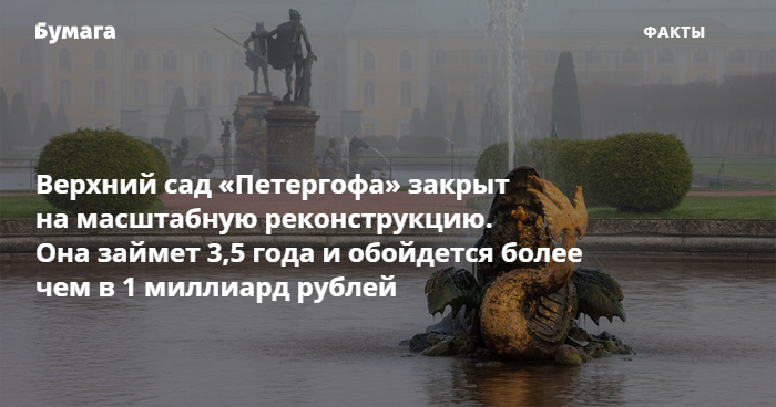 В конце июля в Верхнем саду «Петергофа» начались реставрационные работы. Они продлятся три с половиной года. Во время ремонта в парке приведут в порядок подземные коммуникации, фонтаны и малые архитектурные формы. Планируется снести четверть зеленых насаждений — но вместо них обещают посадить новые.