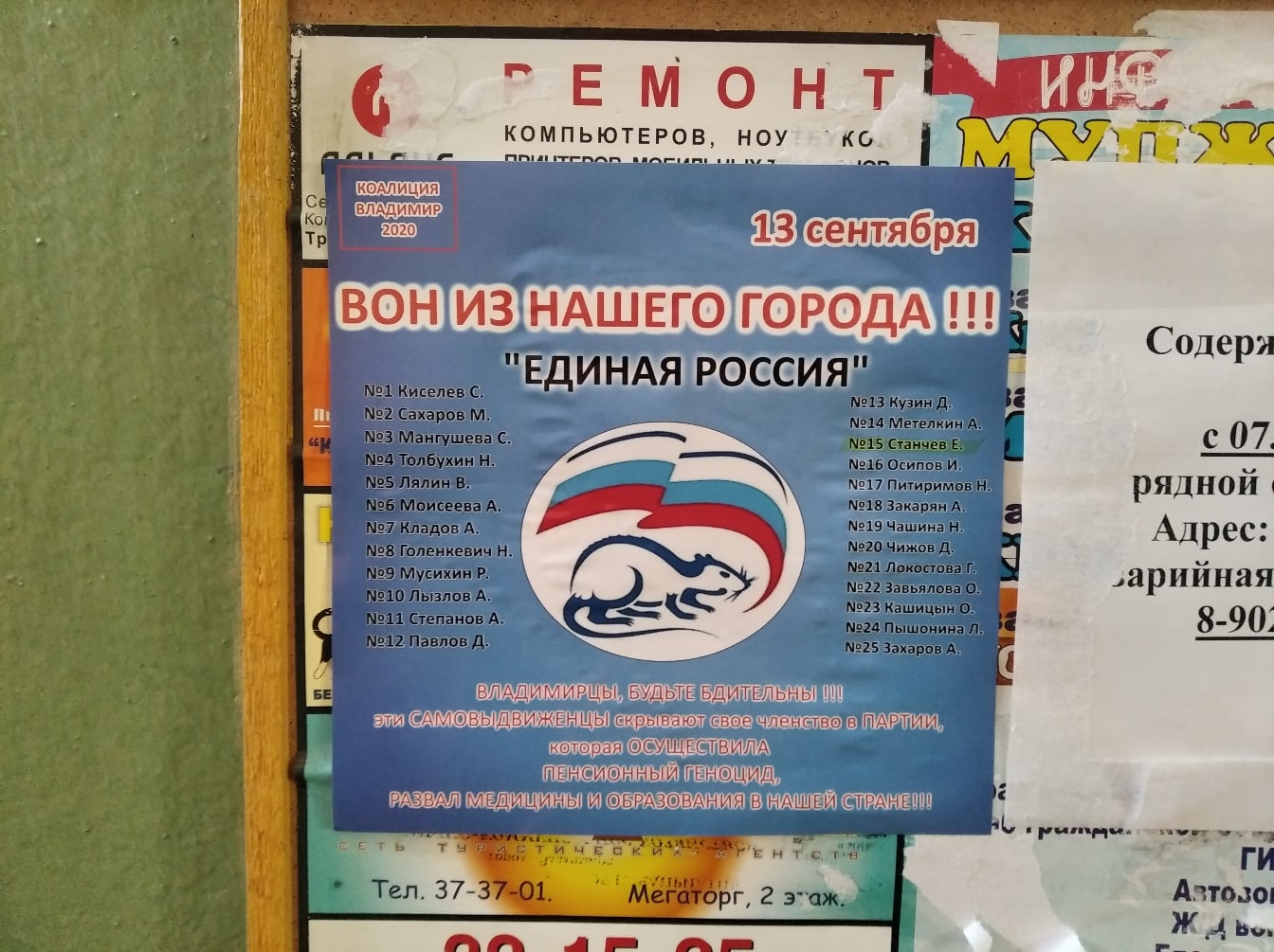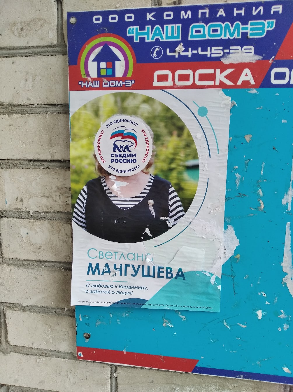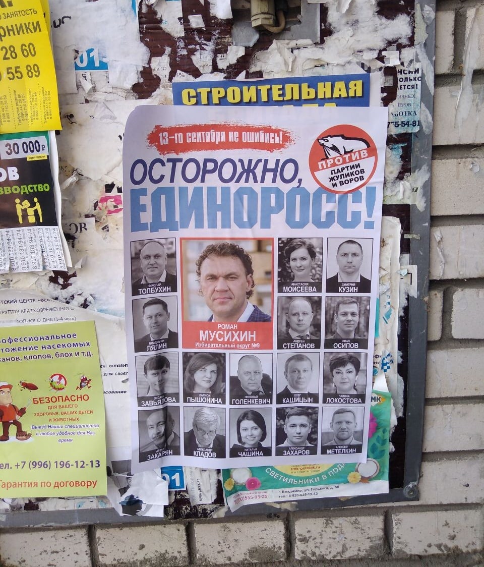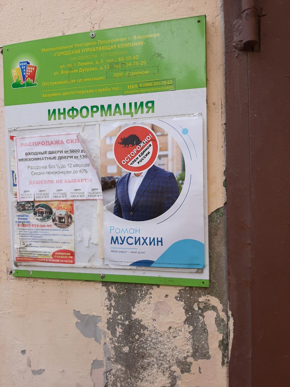 Обычно местные жители самостоятельно срывают агитацию за кандидатов от “Единой России” со своих подъездов. Однако некоторые инициативные владимирцы размещают разнообразные наклейки и плакаты, которые информируют жителей города о настоящей партийной принадлежности кандидатов-единороссов.