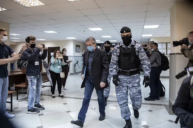 — такие реплики порхают на лестнице и в коридоре в финальной мизансцене событий, когда Михаила Ефремова, взятого под стражу в зале суда, выводят на публику.