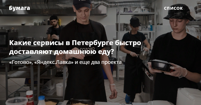 Первым сервисом быстрой готовки и доставки еды в Петербурге стал «Готово». В октябре 2019 года проект запустили продюсер Саша Церетели (клуб «Клуб»), ресторатор Олег Корчагин (Petshop.ru) и разработчик Евгений Родионов.