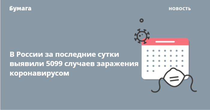 В России за последние сутки выявили 5099 случаев заражения коронавирусом, из них 210 — из Петербурга. Об этом сообщает оперштаб по борьбе с распространением инфекции.