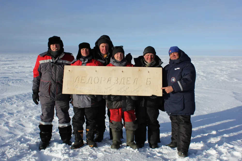 26 января поход прибыл на Ледораздел Б. Сразу же после этого был начат монтаж буровой установки и организованы стационарные геодезические наблюдения (в будущем они позволят точно определить скорость и направление движения льда). А затем была установлена памятная табличка, на фоне которой было сделано общее фото.