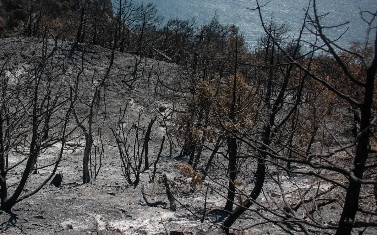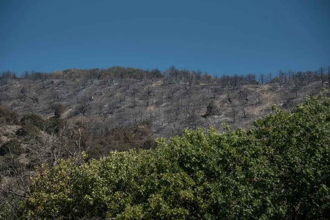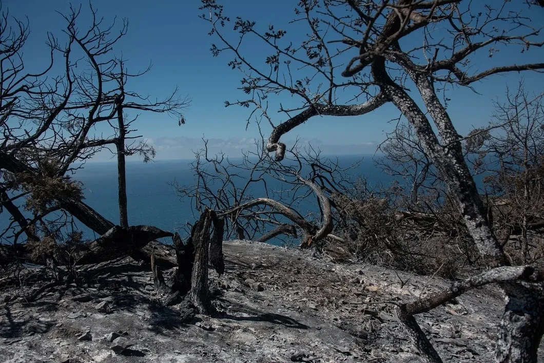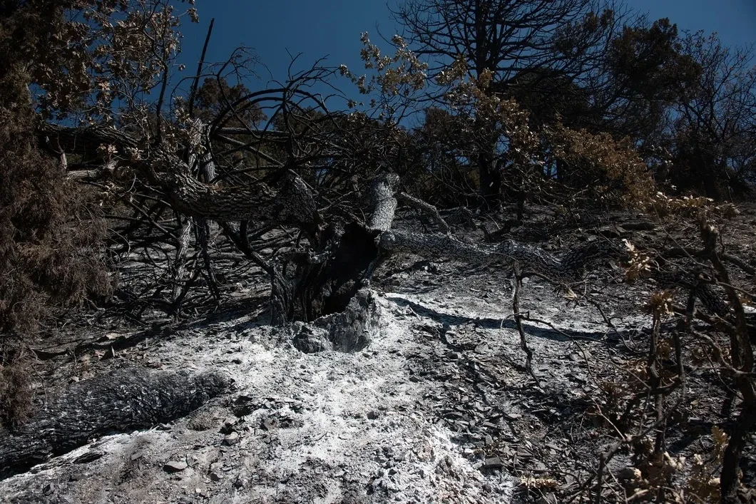 Горные склоны, пострадавшие от огня, выглядят как кладбище, только вместо надгробий — черные, обугленные остовы можжевеловых деревьев. Земля усыпана плотным слоем пепла. Пахнет гарью.