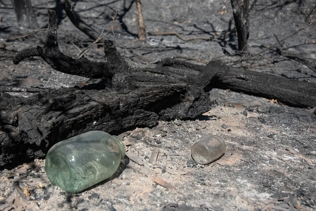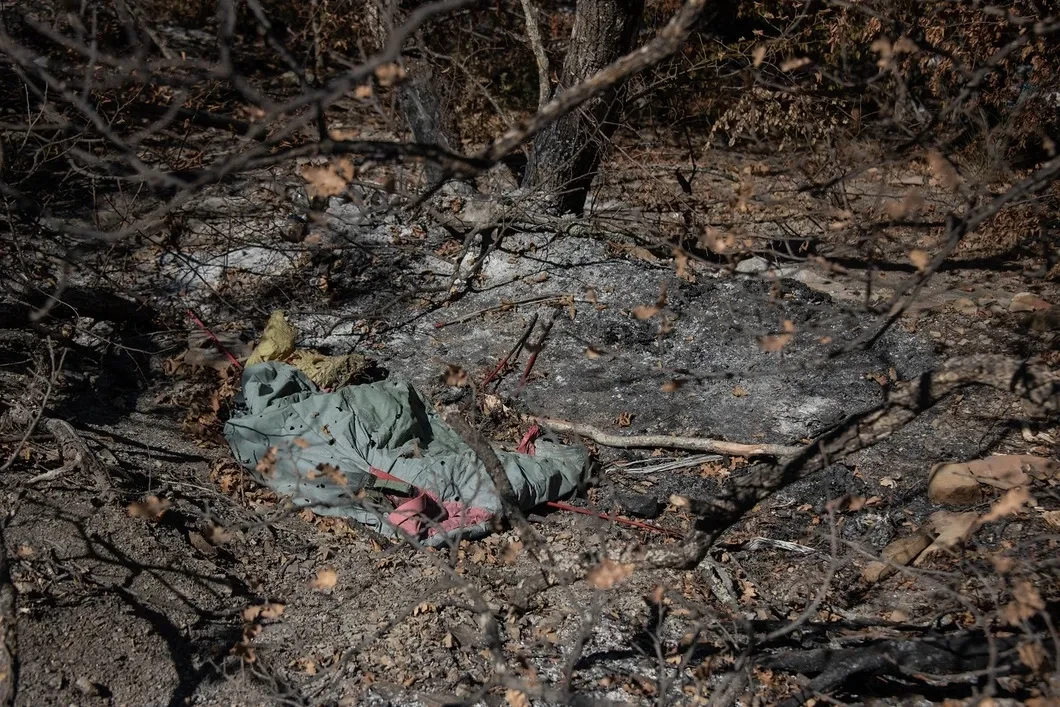 Мы на месте, где предположительно начался пожар, — на склоне в районе Базовой щели. На земле — следы от стоянки отдыхающих: палатка, сломанная горелка и трехлитровая банка. Лесничий говорит, что огонь мог образоваться от линзы, а дальше от жара сдетонировали газовые баллончики.