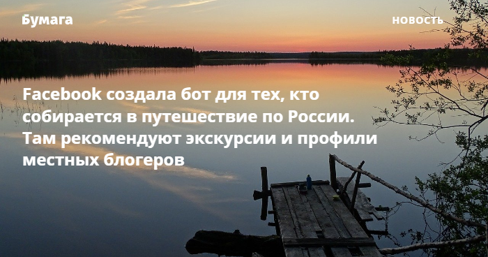 Компания Facebook запустила чат-бот для тех, кто собирается в поездку по России. В сервисе собраны рекомендации для путешественников — от экскурсий по городу до профилей местных блогеров.
