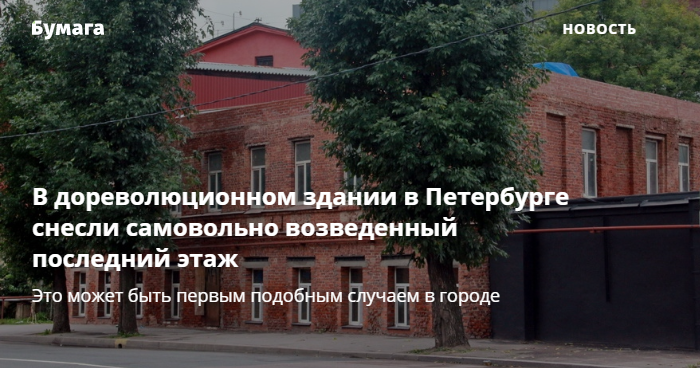 В дореволюционном здании на улице Степана Разина, 9 в Петербурге снесли самовольно возведенный третий этаж. Об этом сообщает Kanoner.
