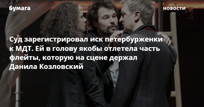 Женщина заявила, что получила травму в декабре 2019 года во время спектакля «Гамлет». Она утверждает, что ей в голову отлетела часть металлической флейты, которой в качестве реквизита пользовался артист Данила Козловский.
