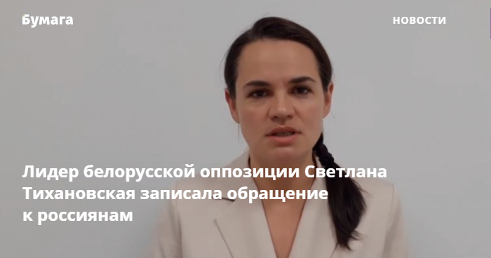 Лидер белорусской оппозиции Светлана Тихановская записала обращение к россиянам, в котором поблагодарила их за поддержку и попросила не верить пропаганде. Ролик опубликовал телеграм-канал «Пул первой».