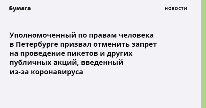 Уполномоченный по правам человека в Петербурге Александр Шишлов призвал отменить запрет на проведение одиночных пикетов в городе и других публичных мероприятий, обусловленный мерами против распространения коронавируса. Об этом говорится на сайте омбудсмена.