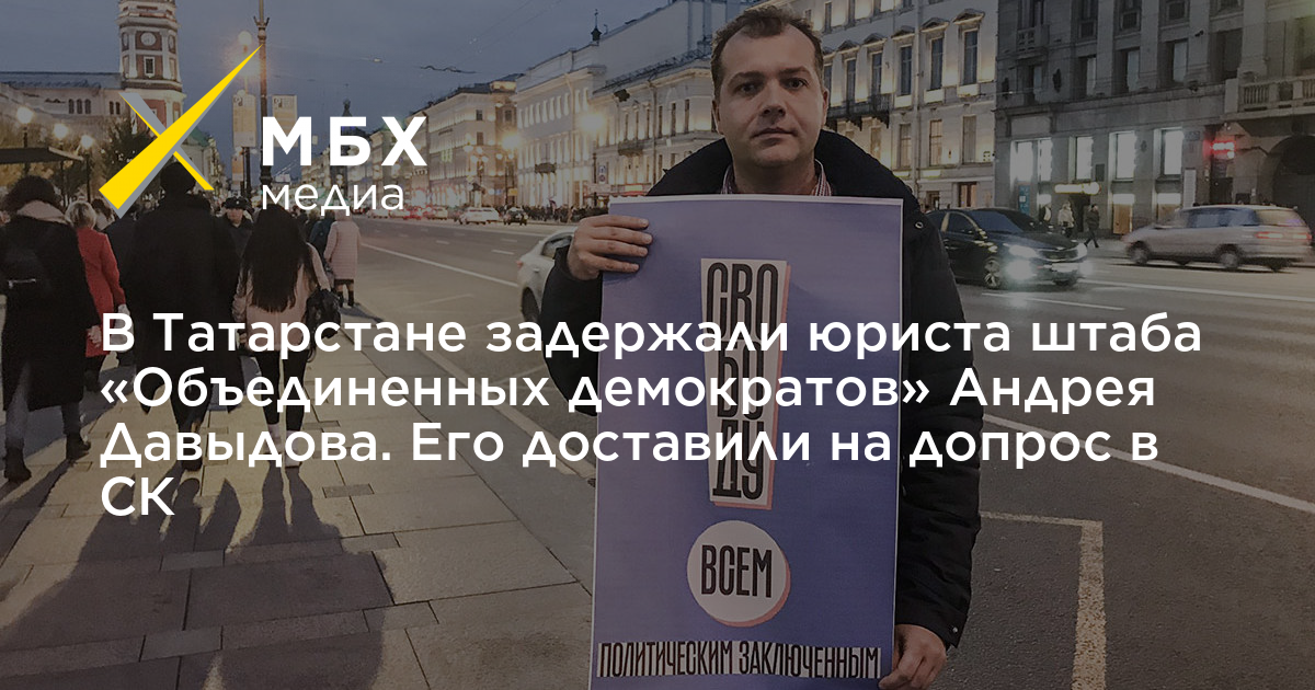 В Казани на входе в Верховный суд Татарстана задержали юриста штаба «Объединенных демократов» Андрея Давыдова, его доставили на допрос в Следственный комитет. Об этом Давыдов рассказал «МБХ медиа».