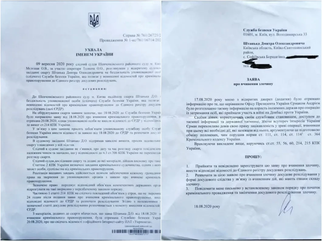 «Только что Шевченковский суд обязал СБУ открыть производство по ст. 111 (государственная измена) и ст. 114 (шпионаж) относительно Ермака! Заявление подал Дмитрий Штанько. Дело связано со сливом операции по вагнеровцам. На честное слово от Баканова (председателя СБУ. —О. М.) надежд, конечно, мало. Потому мы продолжаем требовать создания временной следственной комиссии в Верховной Раде».