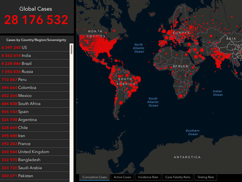 По данным университета, число инфицированных составляет 28 174 590 человек, умерли 909 672 человека, выздоровел 18 849 981 заразившийся. Больше всего случаев заражения (6 397 227) зафиксировано в США. Далее следуют Индия (4 562 414) и Бразилия (4 238 436). В России, по данным федерального оперативного штаба по борьбе с коронавирусом, зарегистрировано 1 051 874 случая заражения, выздоровели 868 107 человек, умерли 18 365.