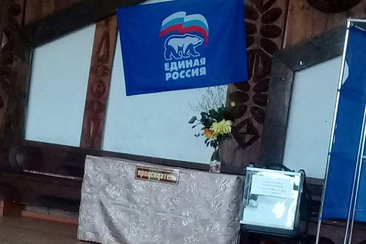 13:58 А вот так обустроили УИК №971 в селе Барлук Куйтунского района Иркутской области. Флаг «Единой России» прямо над столом председателя и переносной урной.