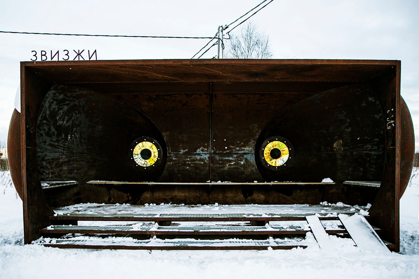 Автобусный павильон из цистерны мог бы соперничать с советскими модернистскими остановками, прославленными канадским фотографом Кристофером Хервигом. В 2015 году кураторы Юлия Бычкова и Антон Кочуркин перенесли «Архстояние» из лесов и полей в деревню Звизжи и предложили архитекторам решить ее насущные проблемы. Самым функциональным объектом фестиваля оказался как раз «Бельведер» Алексея Козыря (если вы бывали в московском парке «Зарядье», могли видеть их с Александром Пономаревым ледяную пещеру).