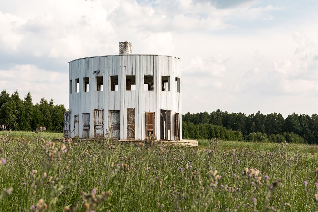 В утонченном облике «Ротонды» на первый взгляд нет ничего крестьянского, но внутри у нее прячется настоящая печь, а обшарпанные двери, расположенные по периметру, собирали по разрушенным домам в окрестностях. Давать вещам вторую жизнь — один из любимых приемов автора, взять хоть «Павильон водочных церемоний», собранный из фабричных окон для фестиваля «АртКлязьма».