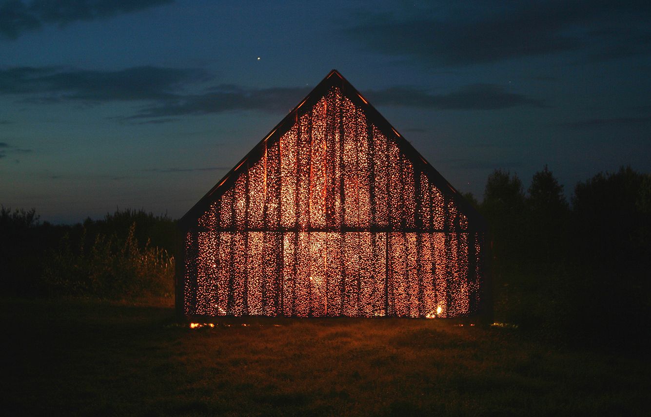 Постройку возводили без чертежей: архитекторы просто прислали фестивалю инструкцию длиной 400 символов. У зданьица нет окон — зато стены продырявлены, как терка: днем и изнутри «Сарай» похож на планетарий, ночью и снаружи — на марокканскую лампу.