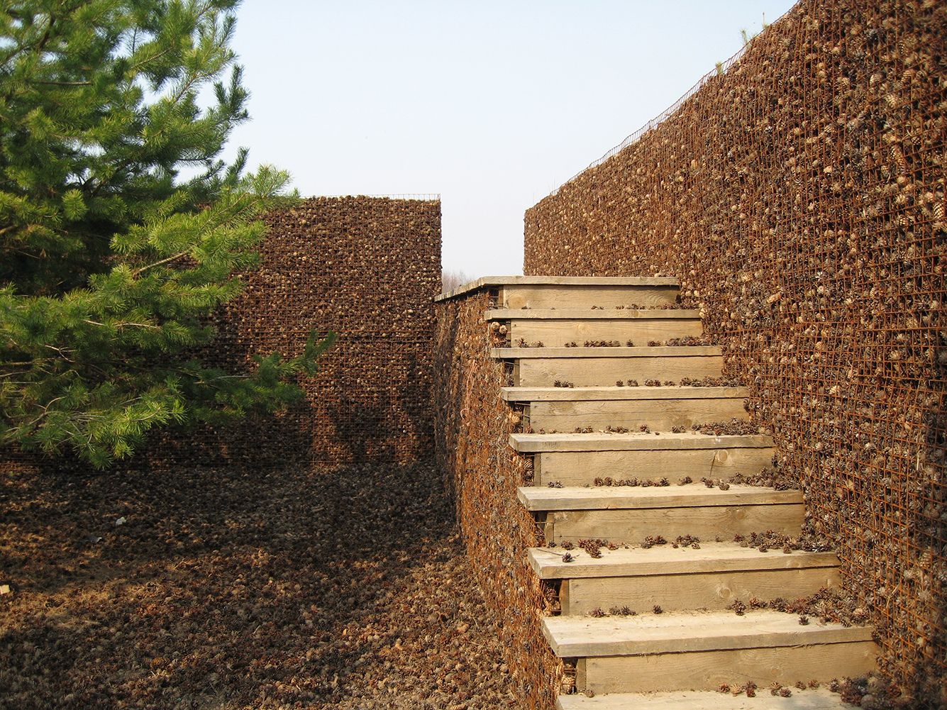 Проект для «Никола-Ленивца» Гезе придумал, размышляя над понятием «граница» — эту тему куратор Антон Кочуркин выбрал для второго «Архстояния». Техника, которую использовал нидерландец, похожа на габион, только стены укреплены досками, а вместо камней — сосновые шишки. В павильон попадают по лестнице, внутри находится двор-колодец с четырьмя молодыми соснами.