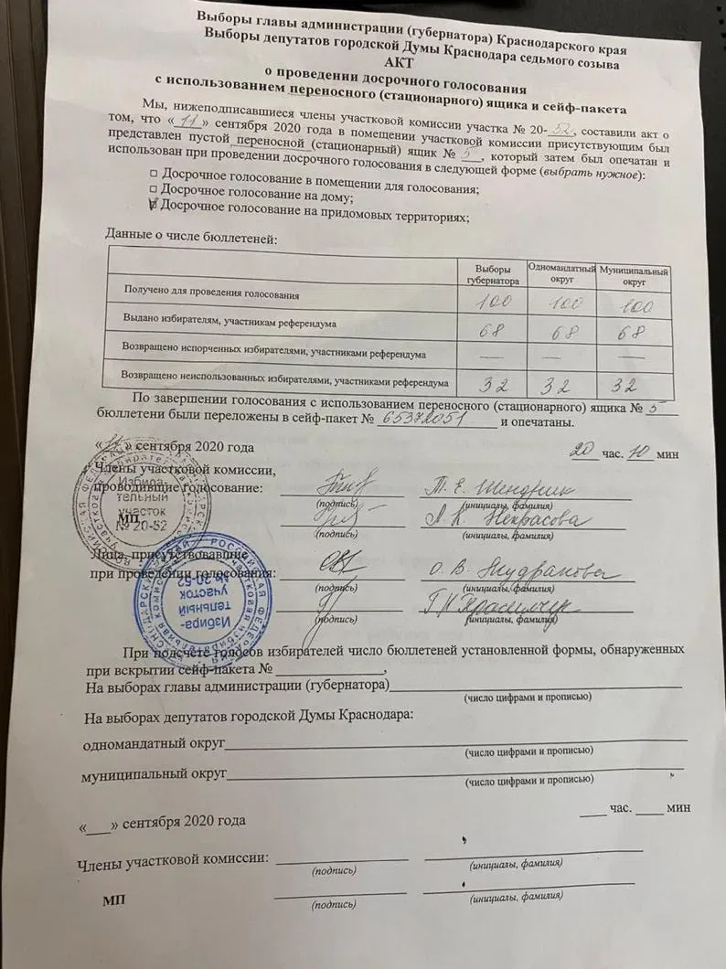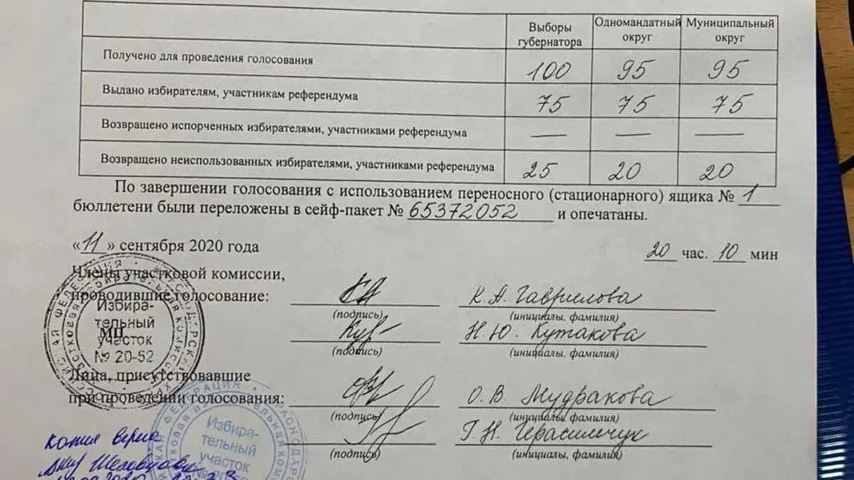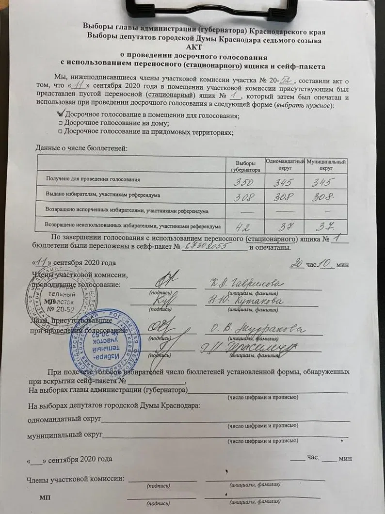 В Краснодаре на УИК № 2052 члены избирательной комиссии изменили протоколы первого дня голосования 11 сентября и переписали цифру выданных бюллетеней в двух сейф-пакетах с 376 на 124. Об этом «Новой газете» рассказала координатор «Открытой России» Татьяна Усманова.