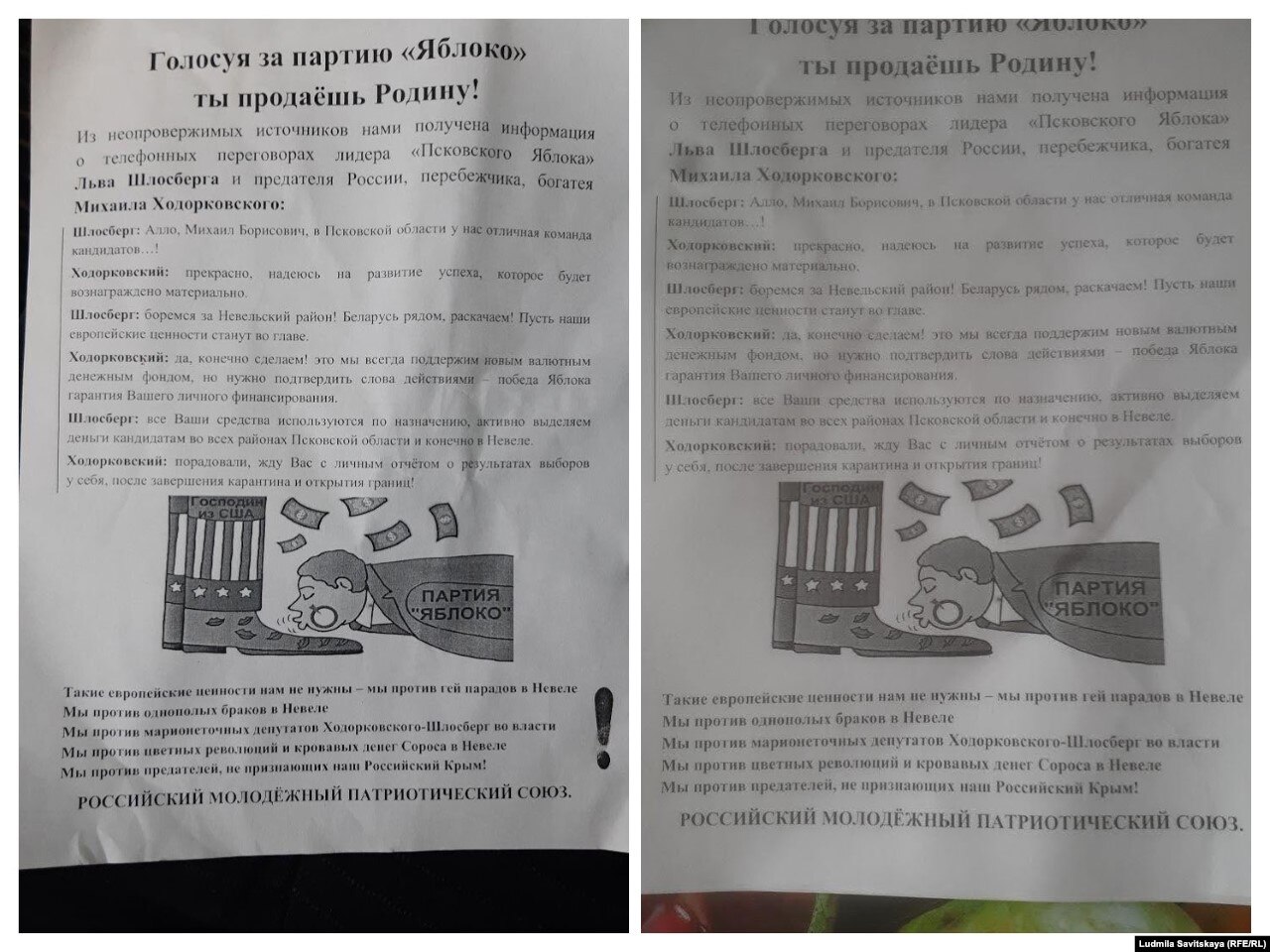 В городе Невель Псковской области в ночь на 12 сентября неизвестные распространили листовки с якобы "перехваченными" переговорами лидера регионального отделения партии "Яблоко" Льва Шлосберга и общественного деятеля Михаила Ходорковского. Об этом сообщает Север.Реалии со ссылкой на кандидатов в депутаты Невельского района от "Яблока" Юлию Беляеву и Альберта Кузьмина.